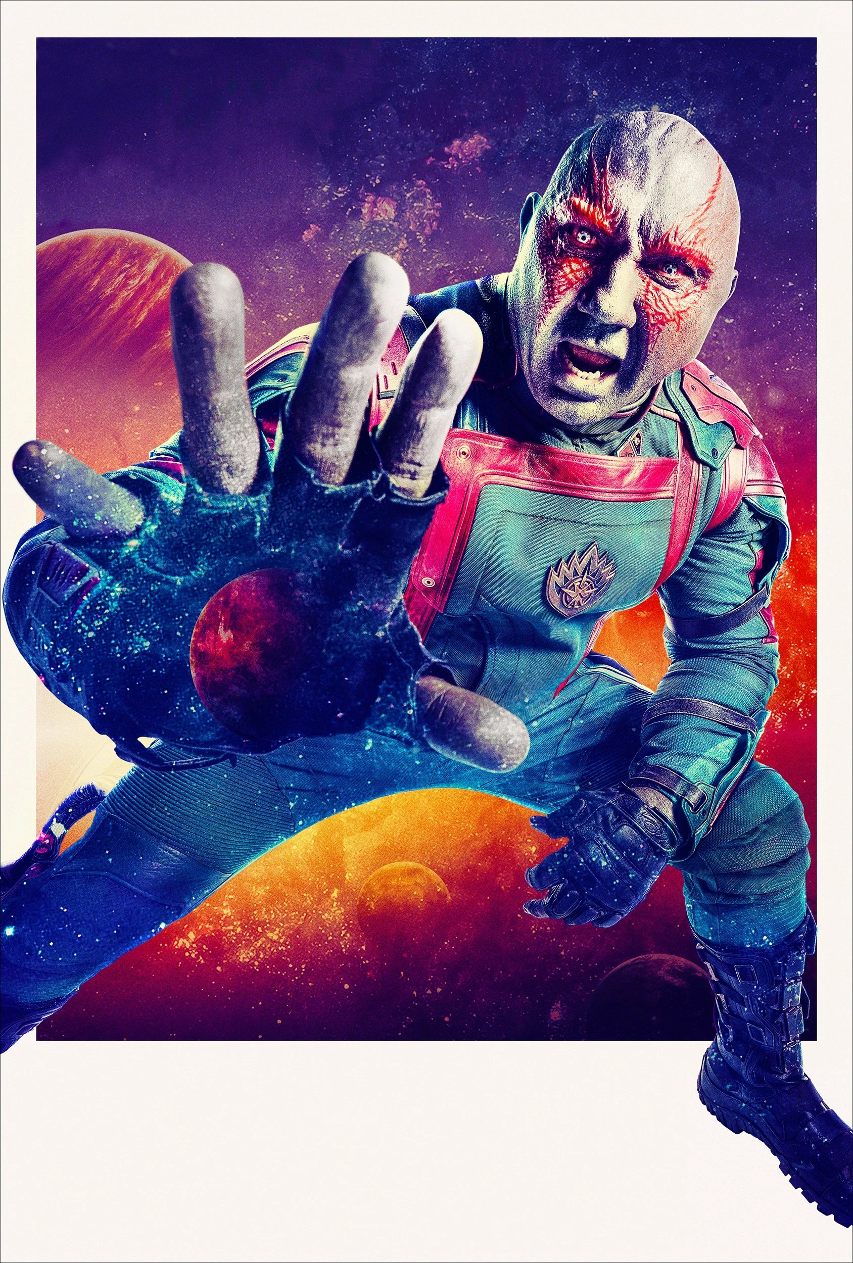 - Descrição: Um Kylosiano movido pela obsessão em obter vingança contra o indivíduo que acreditava ser o assassino de sua esposa e filha, Ronan. Após a morte de seu adversário, Drax percebeu que Thanos era o verdadeiro responsável pelo ocorrido, e prometeu matar o Titã Louco quando o momento chegar. Sua busca anterior por Ronan resultou em sua entrada na equipe, sendo um dos membros desintegrados pelo estalo da Manopla do Infinito, mas revivido após cinco anos. Participou da Batalha da Terra ao lado de seus companheiros e os Vingadores, sobrevivendo e retornando ao espaço.