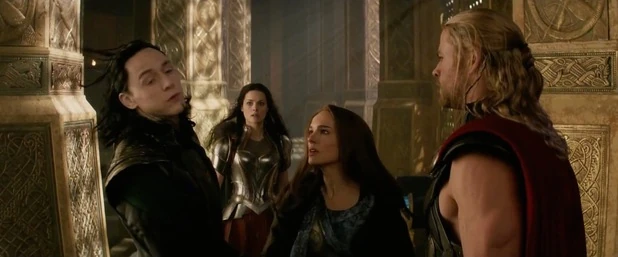Jane, Thor e Loki se preparando para fugir de Asgard enquanto Sif distraia os guardas